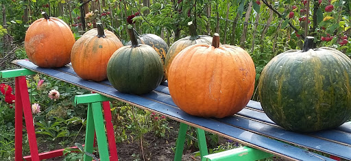 Havekonen har dyrket græskar på komposten. Hun høster dem den 16. oktober. Så skal de bruges til at lave lygter af – primært for børnene med forældre (men kom bare og kig!).