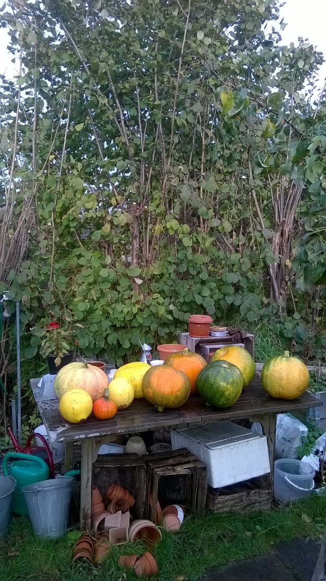 Så er høsten i hus! Vores kompost har – med Lenes hjælp – frembragt 10 flotte græskar (hvoraf måske det ene måske reelt er en hokkaido).